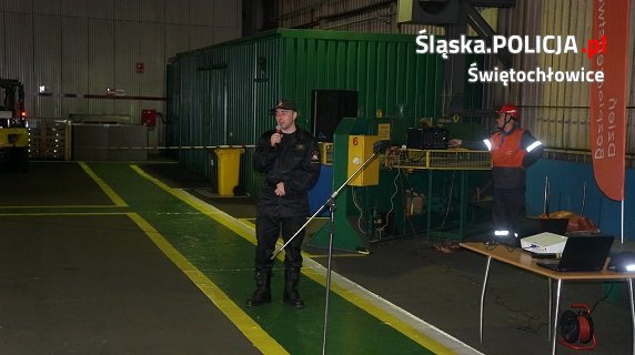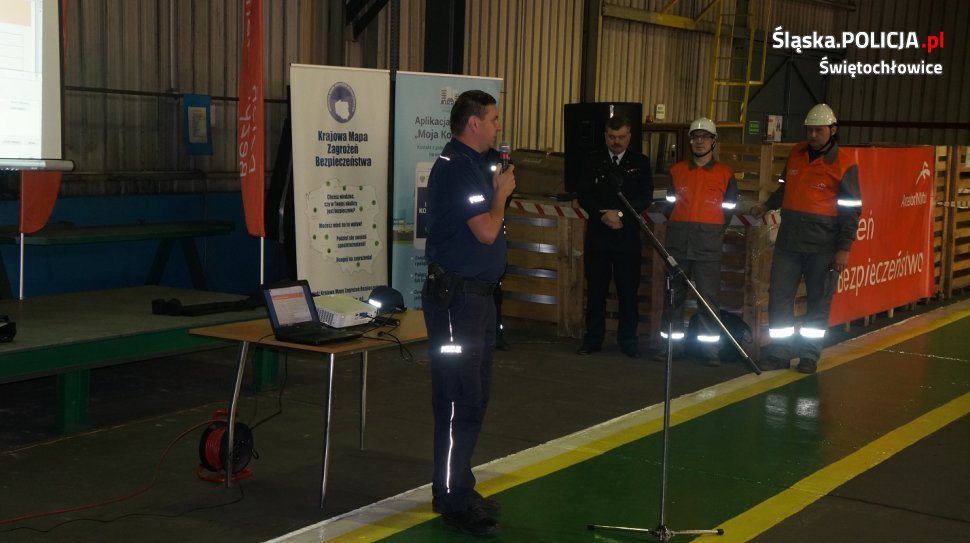 Dzisiaj świętochłowiccy policjanci z dzielnicowymi mł.asp. Marcinem Mierzwą i asp.szt. Adamem Brenzakiem na czele wzięli udział w „DNIU BEZPIECZEŃSTWA” organizowanym przez ARCELOR MITTAL. Prócz prelegentów ze świętochłowickiej komendy głos zabrał Komendant Straży Pożarnej w Świętochłowicach. Promowane byłe szeroko rozumiane bezpieczeństwo. Począwszy od bezpieczeństwa w miejscu pracy, przez bezpieczeństwo pożarowe oraz bezpieczeństwo w drodze do i z zakładu pracy. Głównym założeniem policjantów była promocja narzędzia informatycznego jakim są KRAJOWE MAPY ZAGROŻEŃ BEZPIECZEŃSTWA oraz aplikacji MOJA KOMENDA. Oficer prasowy sierż.szt. Marcin Michalik przeprowadził krótki pokaz obrazujący działanie „map”. Następnie dzielnicowy z rejonu ZGODA mł.asp. Marcin Mierzwa przeprowadził krótką prelekcję na temat odpowiedzialności karnej w momencie podejmowania obowiązków służbowych pod wpływem alkoholu bądź innej podobnie działającej substancji.