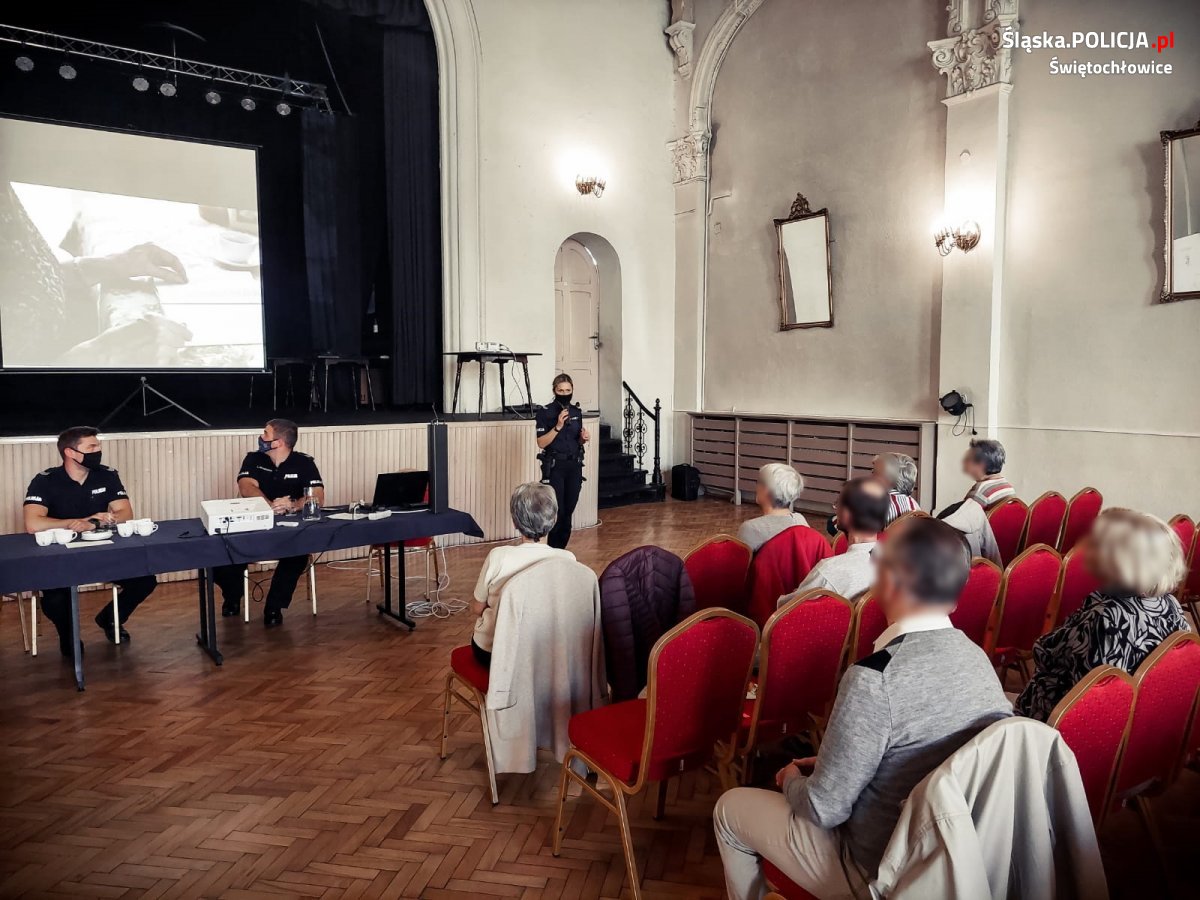 Wczoraj w świętochłowickim CKŚ Grota odbyło się spotkanie dotyczące bezpieczeństwa osób starszych. W ramach Tygodnia Seniora miejscowi mundurowi poprowadzili wykład, którego celem było przekazanie cennych rad ułatwiających codzienne funkcjonowanie seniorów oraz ochrona ich przed zagrożeniem ze strony oszustów. Na koniec wyemitowano i omówiono spot profilaktyczny o nazwie „Nie daj się oszukać!”