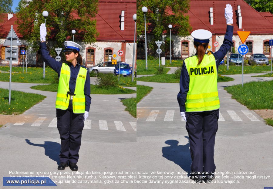Gdy policjant stoi przodem, tyłem lub bokiem do naszego kierunku jazdy z podniesioną ręką – to taką postawę można przyrównać do światła żółtego – NIE MOŻNA WJECHAĆ NA SKRZYŻOWANIE, A POJAZDY KTÓRE WJECHAŁY MUSZĄ SKRZYŻOWANIE OPUŚCIĆ
