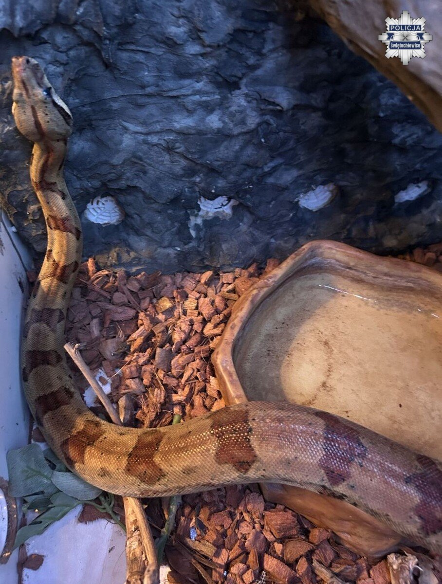 Świętochłowiccy policjanci z wydziału do walki z przestępczością gospodarczą wpadli na trop osoby sprzedającej w internecie egzotyczne zwierzę. Podczas przeszukania w mieszkaniu 60-letniego mężczyzny znaleźli węża, który znajduje się na liście gatunków zagrożonych. Zgodnie z ustawą o ochronie przyrody, handel bez wymaganych zezwoleń okazami objętymi ochroną, zagrożony jest karą do 5 lat więzienia.